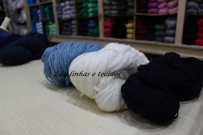 Apesar te ter várias mantas de crochet e tricot, nenhuma tinha as cores pretendidas, pelo que tivemos que ir até à Brancal da Rua dos Fanqueiros e escolher as linhas para começar outra manta (mais um trabalho começado). Trouxemos fio Dralon 4, com 50% de lã e 50% polyester. O modelo já tinha sido escolhido por ela e é igual ao da nossa
